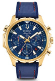 From the Marine Star Collection. Six-hand chronograph function with calendar, gold-tone stainless steel case with rotating dial ring to measure elapsed time, blue dial with gold-tone accents, flat mineral glass, screw-back case, blue leather and silicone strap with red stitch detail and three-piece buckle closure, and water resistance to 100 meters.