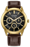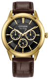 With vintage-inspired style that will never go out-of-date, this latest multi-function Rolan from Citizen takes the classic collection to the next level. The 40mm gold-tone stainless steel case is the perfect base for the watch's black dial, with three sub-dials upon a textured inner sector adding to its distinct appeal. Applied accents and a brown leather strap round out the look, with features including 12/24-hour time and analog day/date indicators to balance the chic aesthetics with the functionality of this sophisticated timepiece. Sustainably powered by any light with our proprietary Eco-Drive technology and never needs a battery. Water resistant up to 100m. Calibre 8729.