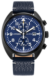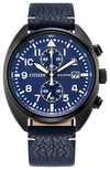 Take action and show your inner drive with the versatile styling of the latest Sport Casual chronograph. The watch features a 41mm black ion-plated stainless steel case with modern, stepped-pushers and a deeply knurled crown. A sandblasted finish adds to the watch's sporty charm, with it secured to the wrist with a navy leather strap. On the blue dial, an aviation-inspired chronograph design is at work, featuring white accents and a 3 o'clock date window. Featuring our Eco-Drive technology – sustainably powered by light, any light. Never needs a battery. Water resistant up to 100 meters. Calibre number B642.