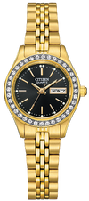 Citizen Quartz round, gold-tone stainless steel case and bracelet, crystal, black dial, 26mm, date, WR, fold over clasp with push buttons.